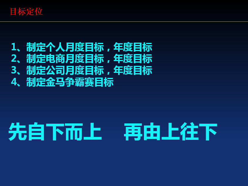 數(shù)據(jù)的來源主要來自于長期網(wǎng)銷工作中的數(shù)據(jù),尤其是爭霸賽的網(wǎng)銷數(shù)據(jù),要對這些數(shù)據(jù)進行收集、分類、整理并作出分析、處理,好的數(shù)據(jù)持續(xù)加強,不好的,要作出改進。有了數(shù)據(jù),才能將企業(yè)目標進行分解,制定出每周的關(guān)鍵詞計劃、推廣計劃并下發(fā)到各崗位,令其有序、高效地完成每周計劃,從而幫助企業(yè)達成業(yè)績目標。